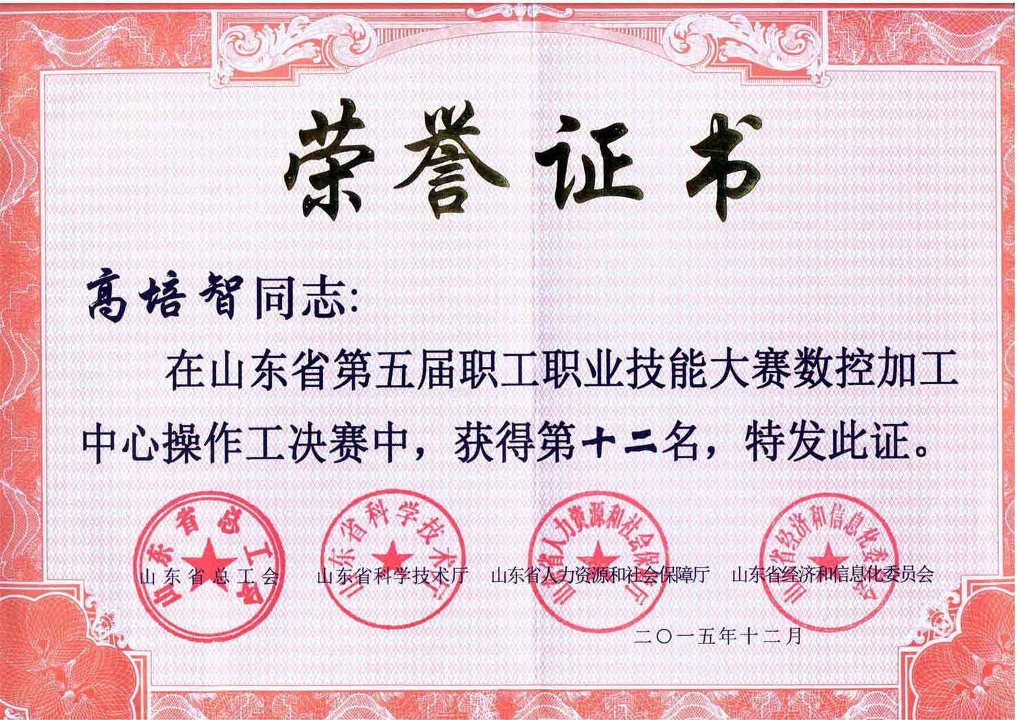 公司員工高培智在山東省第五屆職工職業技能大賽數控加工中心操作工決賽中,獲得第十二名,日前受到省總工會、省科技廳、省人力資源和社會保障廳和省經信委四部門聯合表彰。