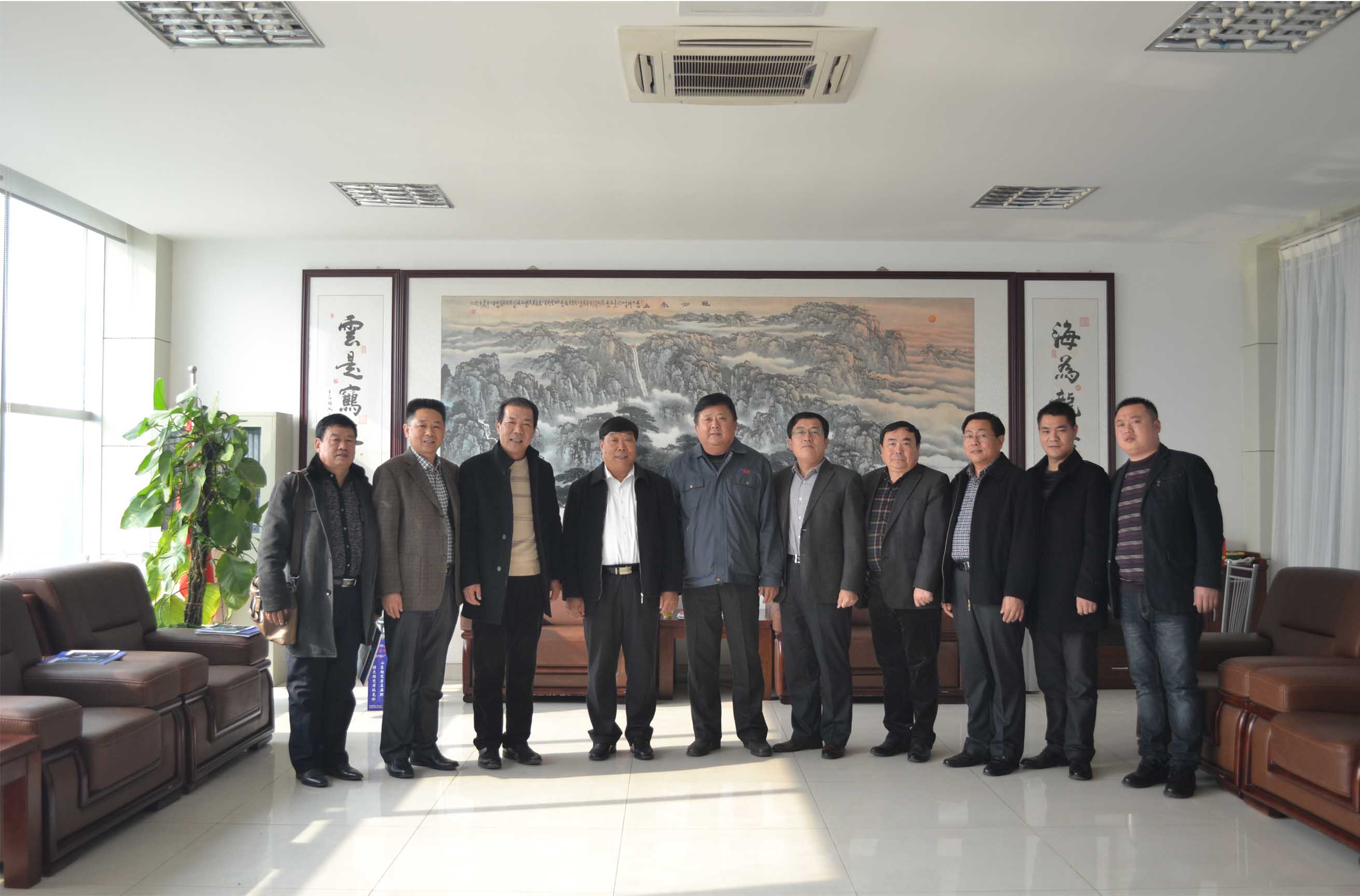 2014年11月21日,淄博市機械行業(yè)商副會長、秘書長張瑛明(右五)帶領商會骨干企業(yè)負責人來集團公司進行友好交流。泰安市機械行業(yè)協(xié)會常務副會長、集團公司董事長、總經(jīng)理康鳳明主持與淄博市機械行業(yè)商會代表團進行了友好交流,泰安市機械行業(yè)協(xié)會副會長、泰安市農業(yè)機械研究所所長吳修文,秘書長、市農機所副所長趙文峰、集團公司常務副總潘憲平參加活動。